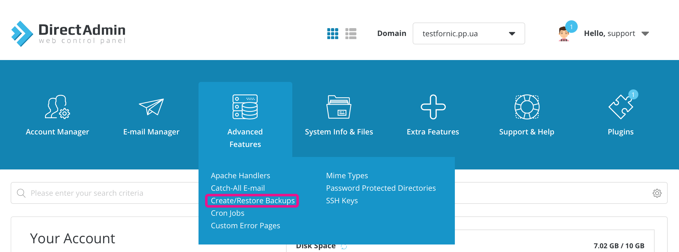 In addition, the hosting panel offers the option of creating a backup copy by yourself and the ability to restore it on the hosting panel's own means. To do this, go to the hosting panel and select the 'Create/ Restore Backups' section in the 'Advanced Features' section.