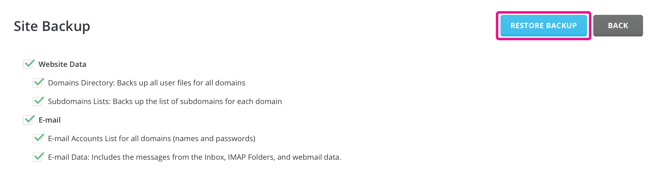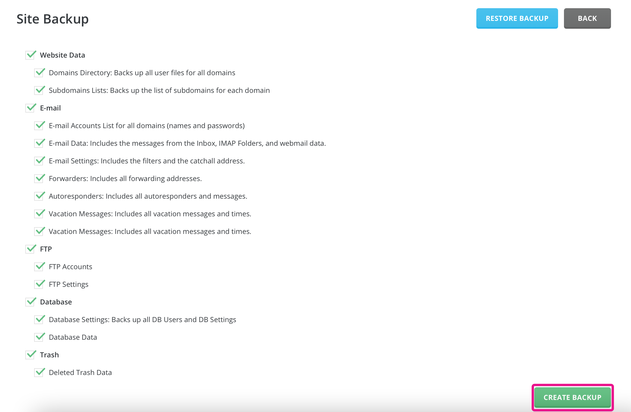 To create a hosting backup, use the checkboxes to select which data you want to add to the archive. Then click the 'Create Backup' button, and you will be notified when the backup starts creating in the background.