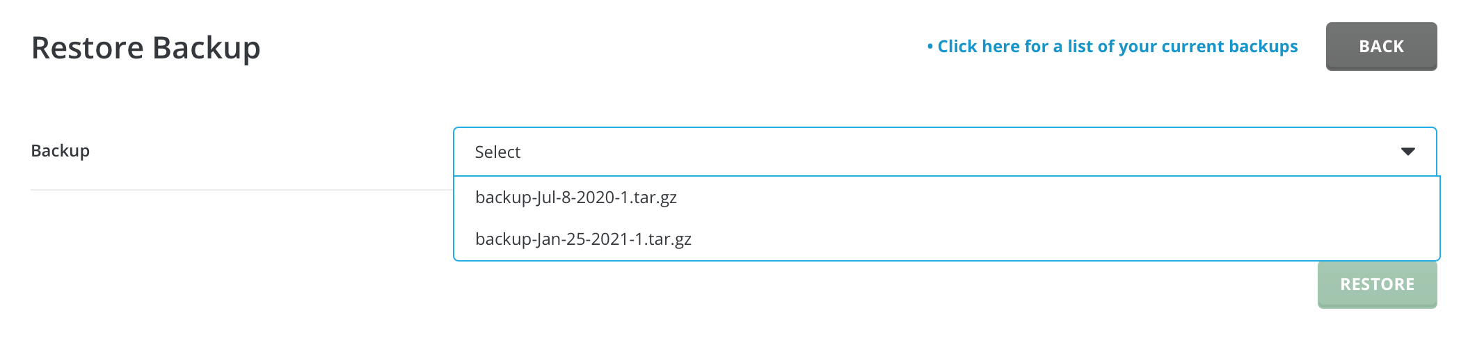 To restore your hosting in the 'Create/ Restore Backups' section, click on the 'Restore backup' button, which is highlighted in the image below.