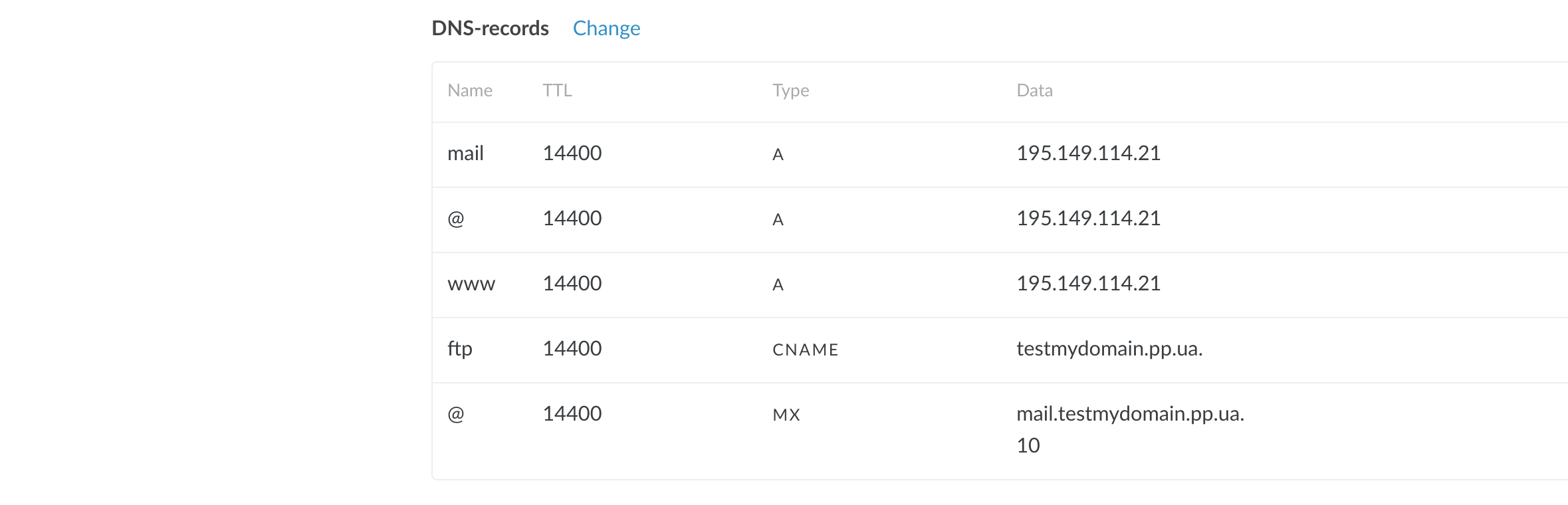 - Management is in the "Name Servers" section. Click on the gear next to the desired NS and you will see a table with all the records. To make changes, click "Change".