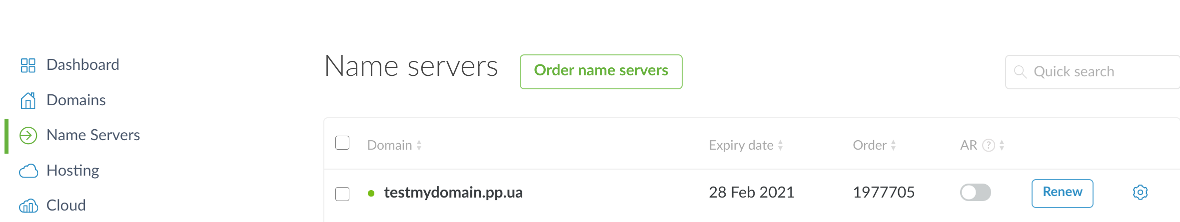 - Place an order for name servers (NS-servers) for your domain on the "Name Servers" page: