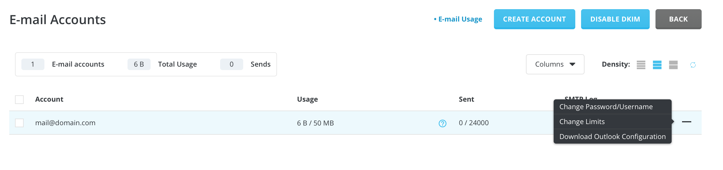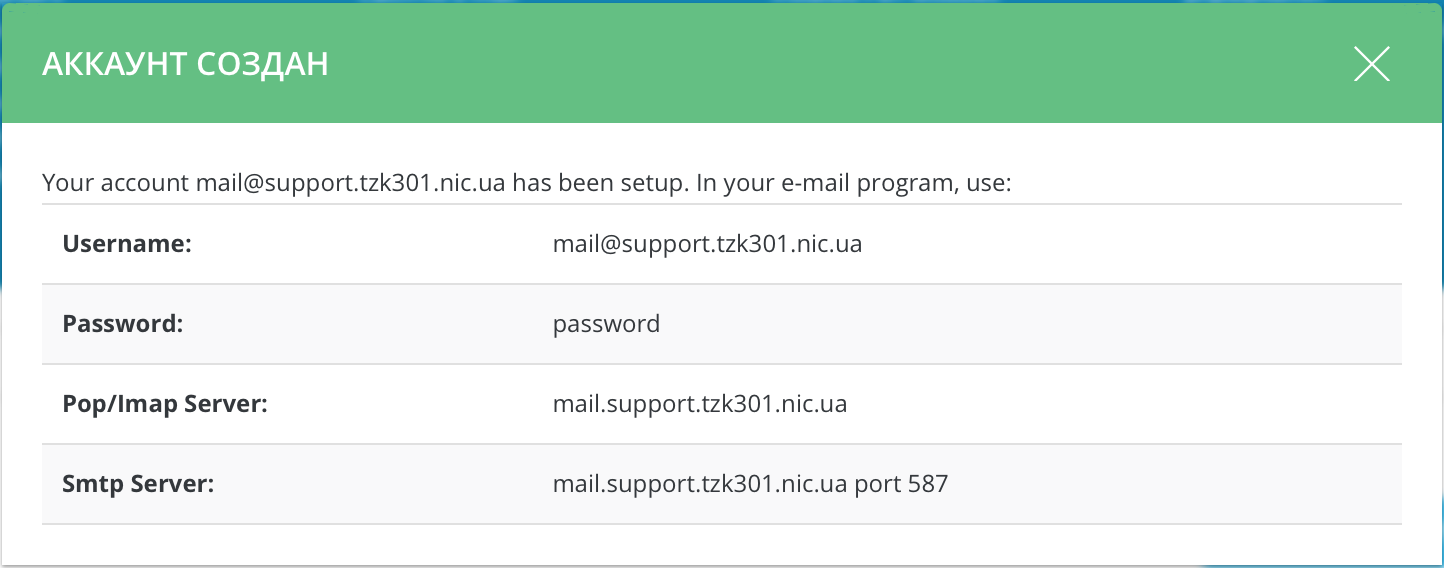 Data for outgoing mail is displayed when you create a mailbox, as well as the username and password for the mailbox.