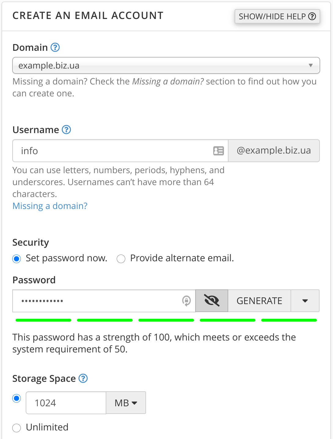 Once created, the email is immediately ready to use. To access it through the web interface, you can open the address http://example.biz.ua/webmail, substitute your domain for “example.biz.ua”.