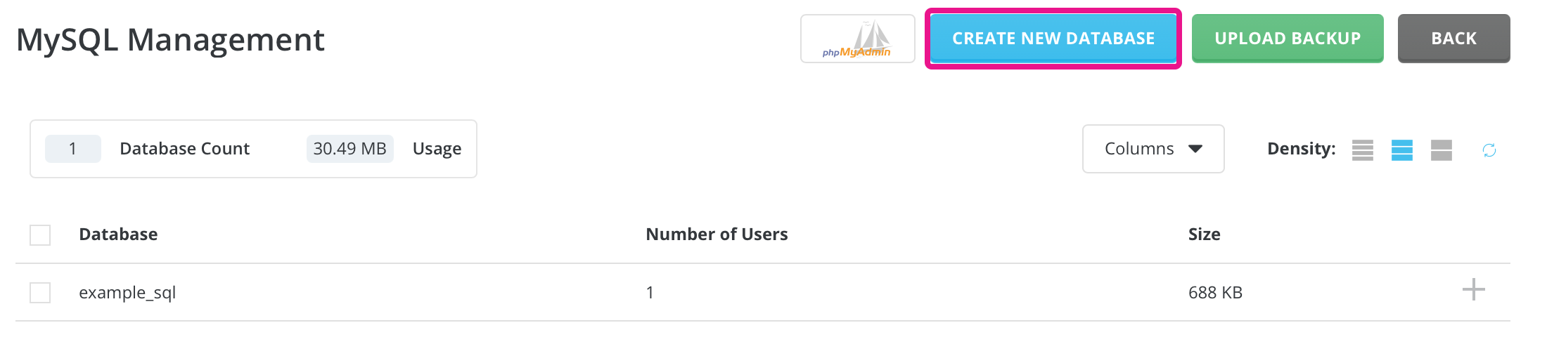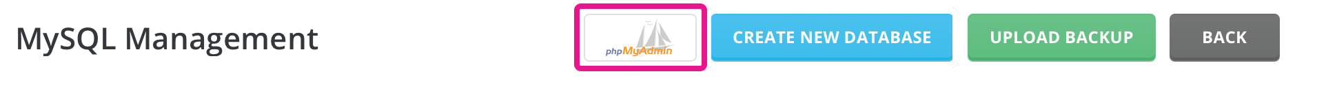 To import the database, go back to the 'MySQL Management' section and click on the 'phpMyAdmin' button highlighted in the image below.