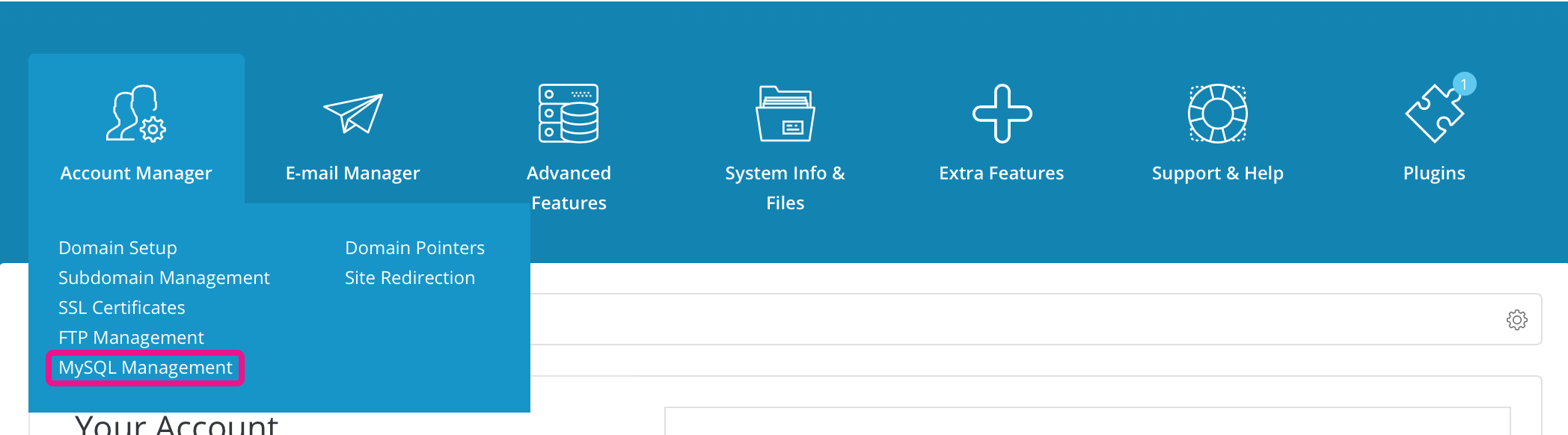 To create a database, go to the hosting panel and select 'MySQL Management' from the 'Account Manager' section.