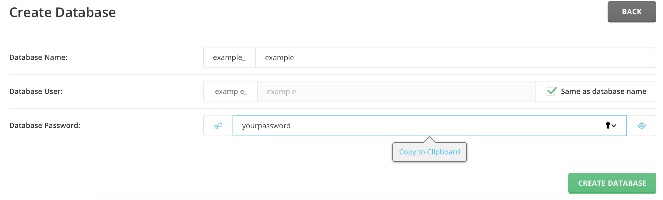 Next, enter the database name, the username and the password to access it. Here you have a choice: the name of the database and the user can be the same, or you can uncheck the box and enter a username that is different from the name of the database.