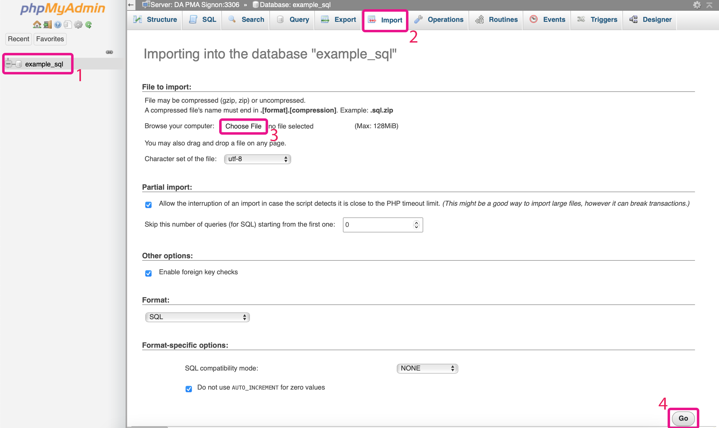 In the phpMyAdmin interface first, select the created database (1) and go to the 'Import' tab (2). Then select the database file using the 'Choose File' button (3) then click the 'Go' button (4).