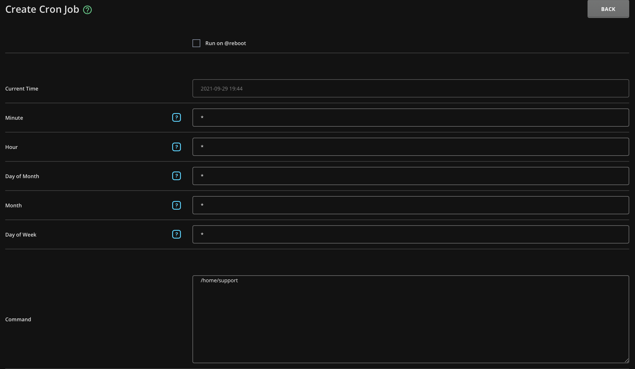 Only the fields that are required are filled in, the rest are left with an asterisk. For example, if you want the task to run every hour at the beginning of the hour, put 0 in the "Minute" field and an asterisk in all other fields — *.