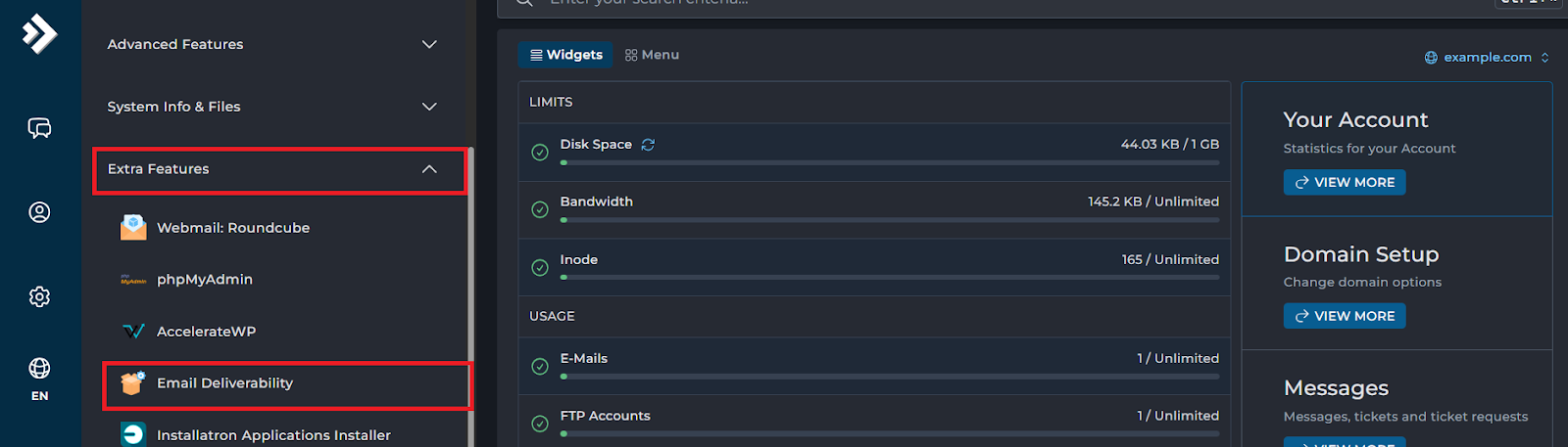 Open your hosting panel, DirectAdmin, and find the "Extra Features" section. Then go to the "Email Deliverability" section.