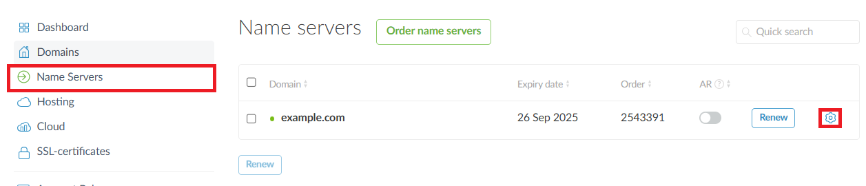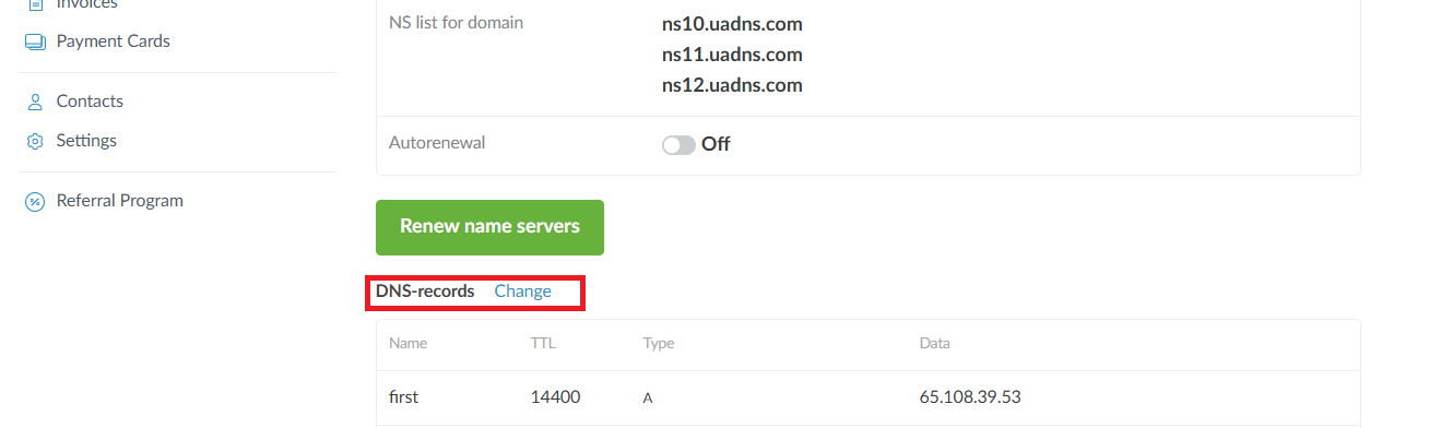 You can find the domain and click the gear button next to it.In the order properties page, scroll down to the “DNS-records” section and click "Change".