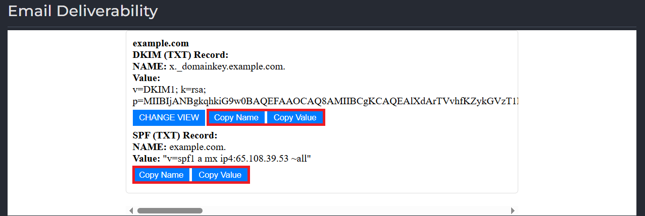 In this section, you will find the values of DKIM and SPF records for all domains added in the hosting panel.