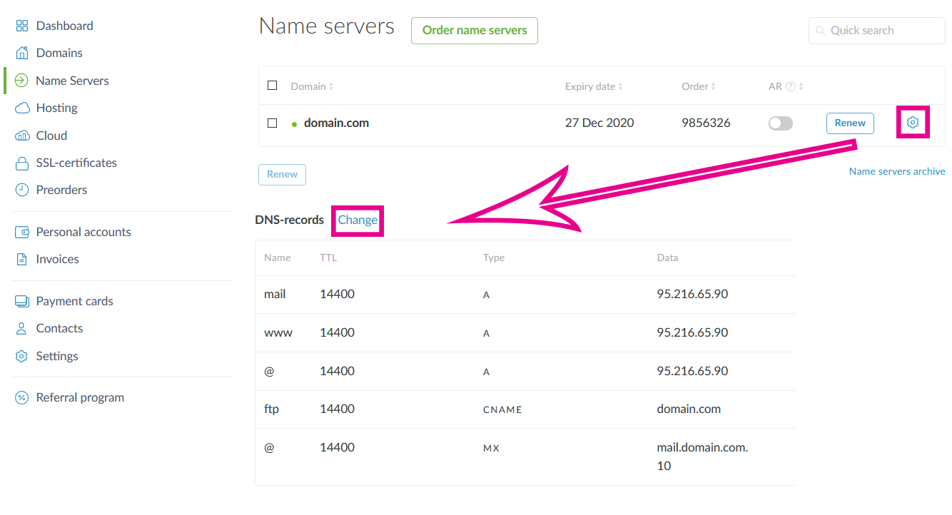 Open the "Name servers (NS)" section and go to the DNS records settings by clicking on the gear next to the name servers; then on "Change" next to the DNS records: