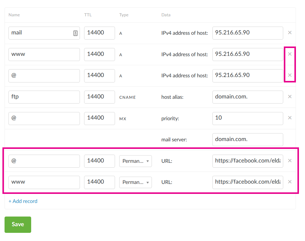 A menu will open for editing and adding DNS records. Most likely, you will already have two records with the names "@" and "www" of type "A". You will need to delete them by clicking on the "X" at the end of the line.