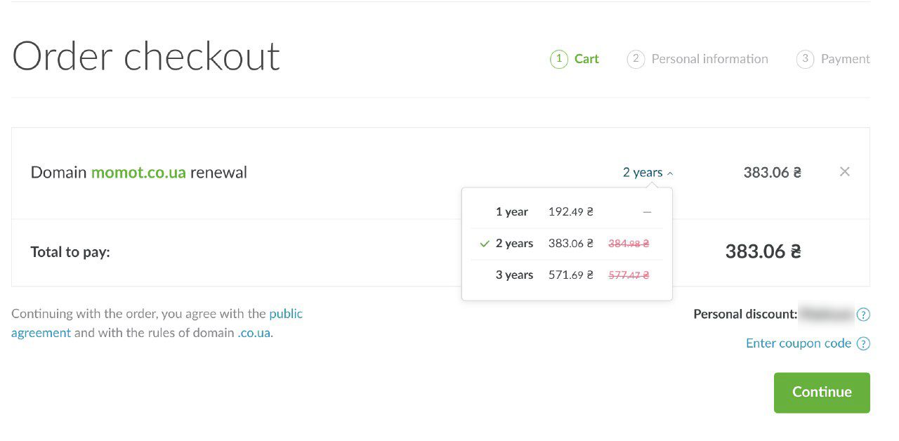 You will immediately go to the cart to place an order. In the first step, you can choose for how many years you want to renew the domain.