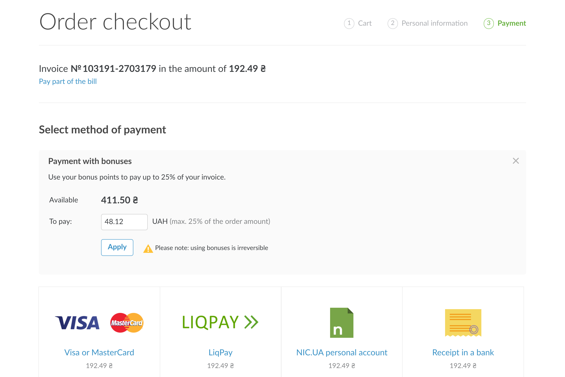 After that, a new invoice will be created in the third step and you will be able to choose a convenient payment method:
