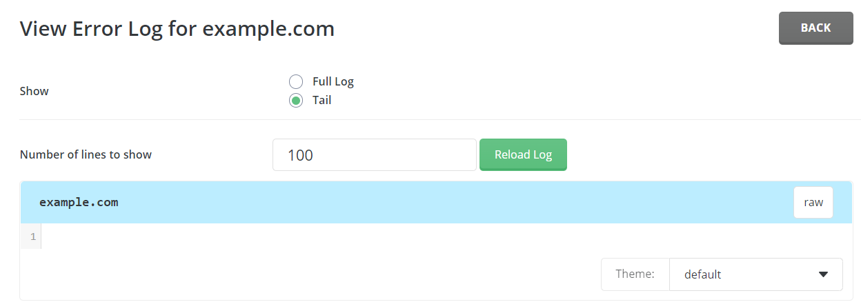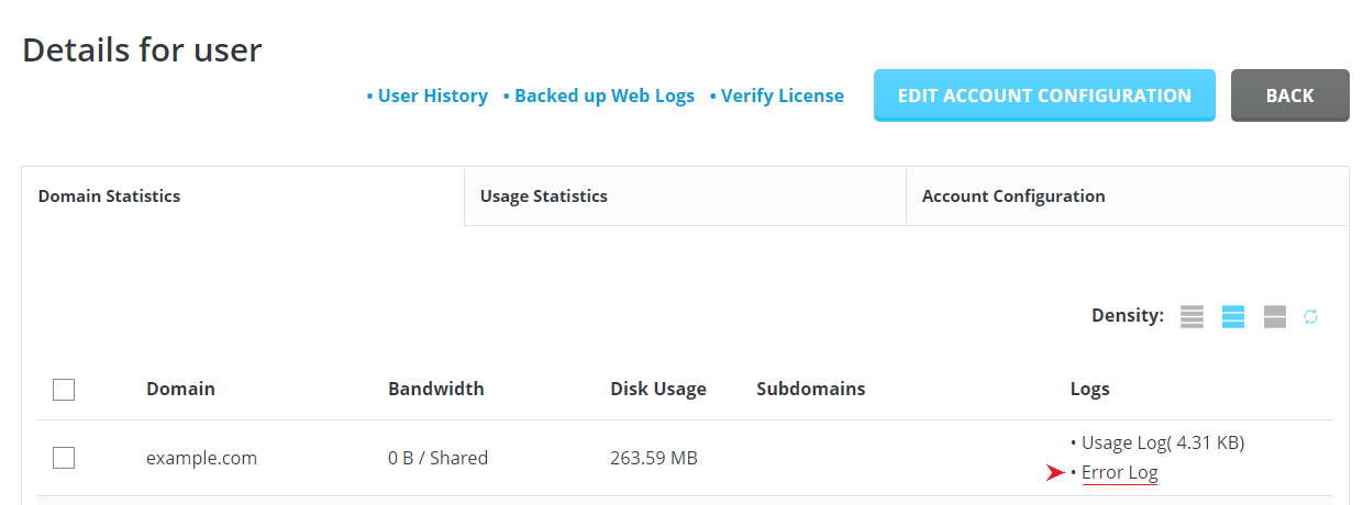 In this section, find the domain you are interested in. Then click on the "Error Log" item in the "Logs" column.