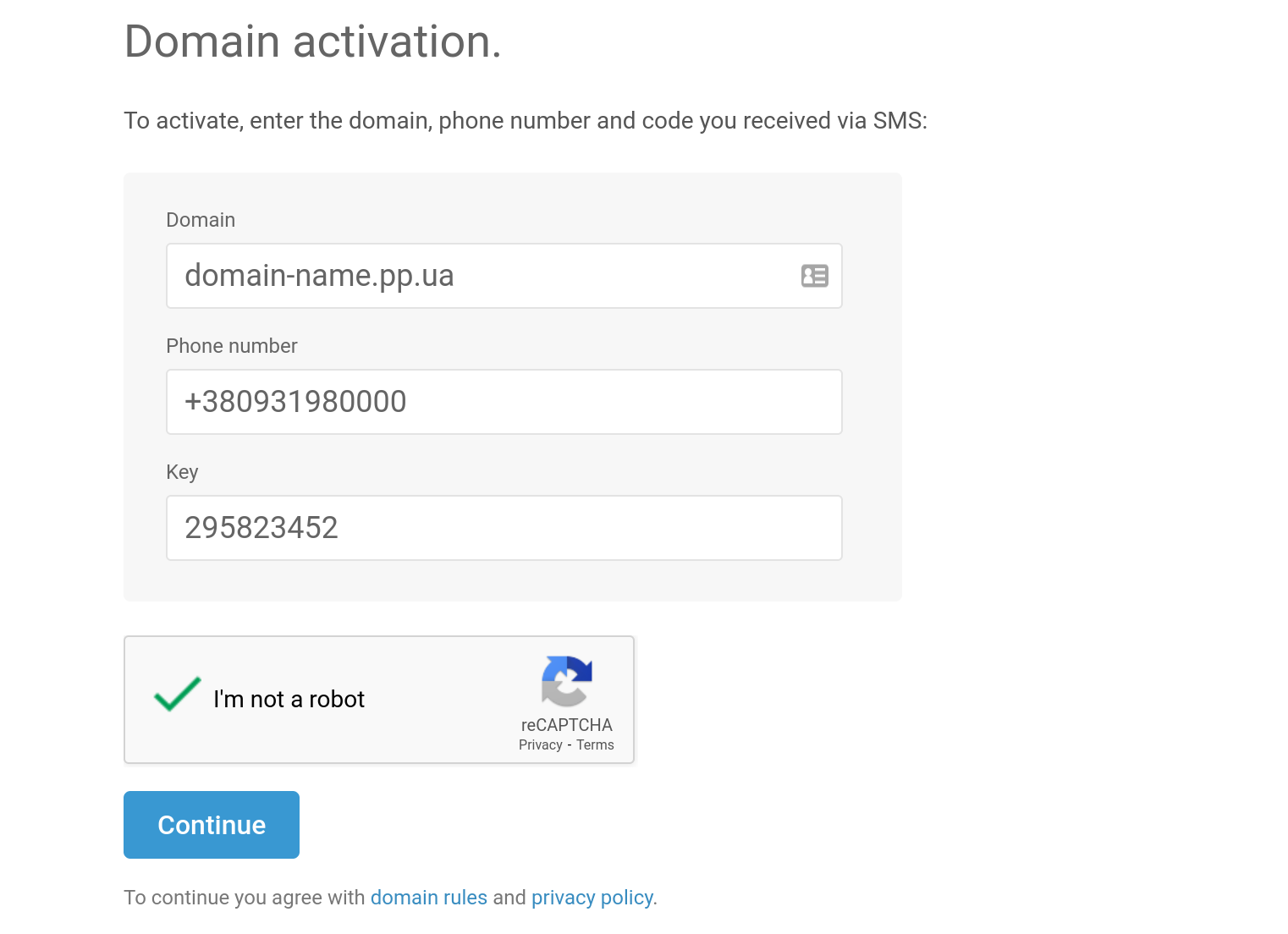 To activate the domain, use the form following the link — https://apu.drs.ua/en/. In the form, enter the domain name, contact phone number, and the code that was received.