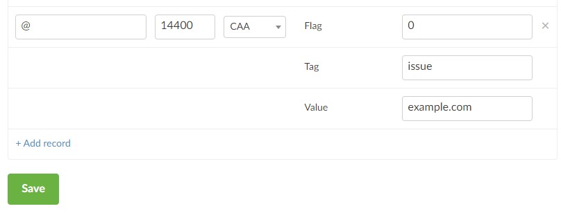 - Value: Certification Authority domain name, for example "sectigo.com".