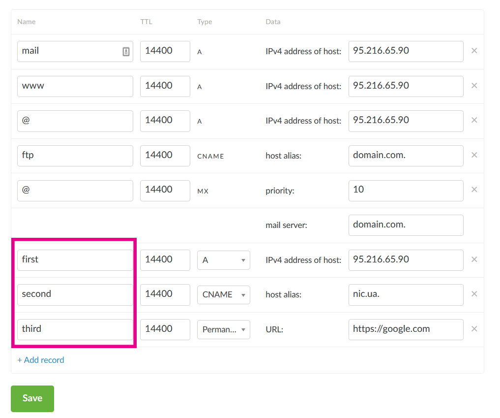 A menu will open for editing and adding DNS records. To create a subdomain that will be directed to hosting, you need to click on "Add record" and create DNS record like this: