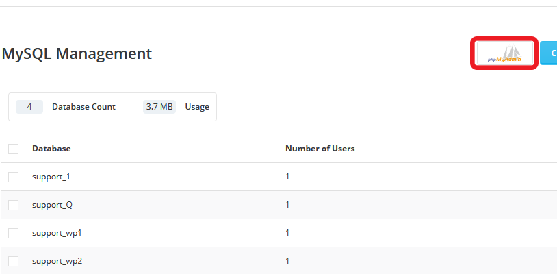? Please note: there are some limitations on phpMyAdmin on hosting related to server security. You cannot create users or databases. Use the "MySQL Management" for this.