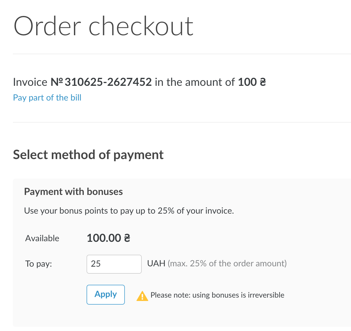 - After you have completed all the steps for placing an order, you get to the payment page. If you have active bonus points, you will be offered to pay part of the account with bonuses. Click "Apply" to pay (in the "To pay" field, the maximum possible amount will always be set for payment with bonus points).