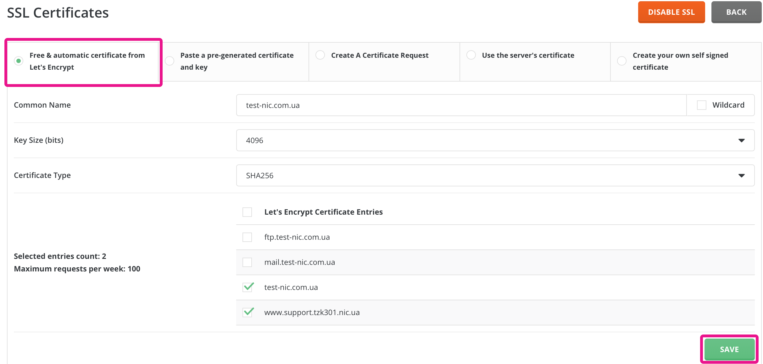 Select "Free & automatic certificate from Let's Encrypt".