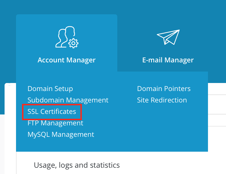 To install your own SSL certificate in the DirectAdmin panel, open "Account Management" -> "SSL Certificates":