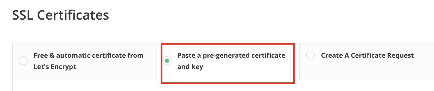 There will be two fields for your certificate data: "Key" and "Certificate". You need to insert the corresponding values into these fields and click the "Save" button. The certificate will work immediately after installation.
