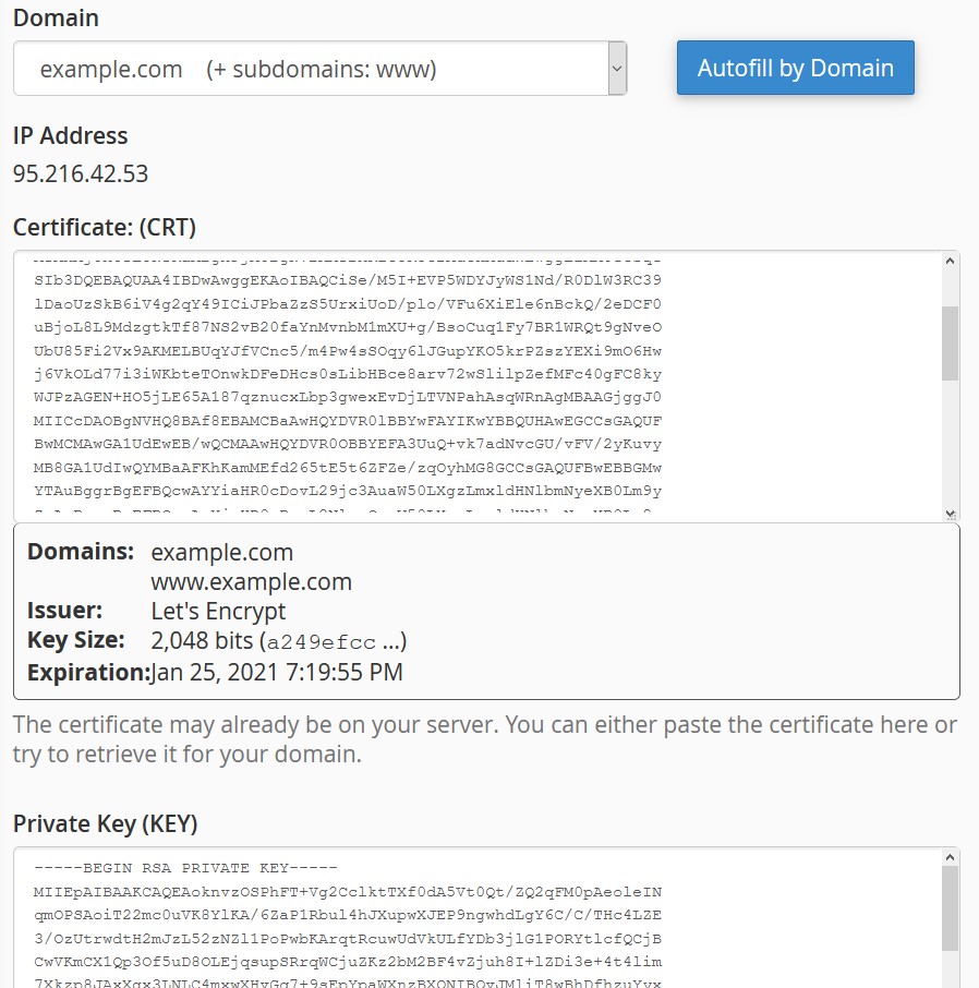 On the new page click on the button "Manage SSL sites" — it is the last link on the page — and the SSL installation page will open. All you have to do is select the correct domain from the list and fill in the CRT/KEY fields with the values you received after certificate activation. (CA Bundle will be filled in automatically. If this does not happen, enter the data manually).