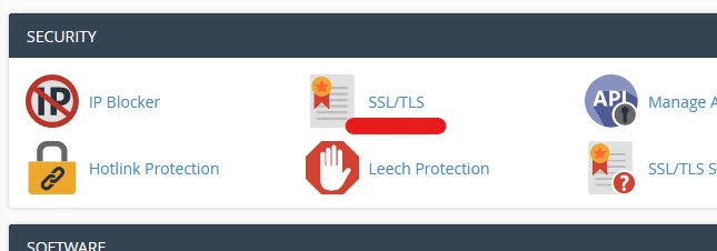When you open cPanel you need to find the "Security" section and click on "SSL/TLS" icon: