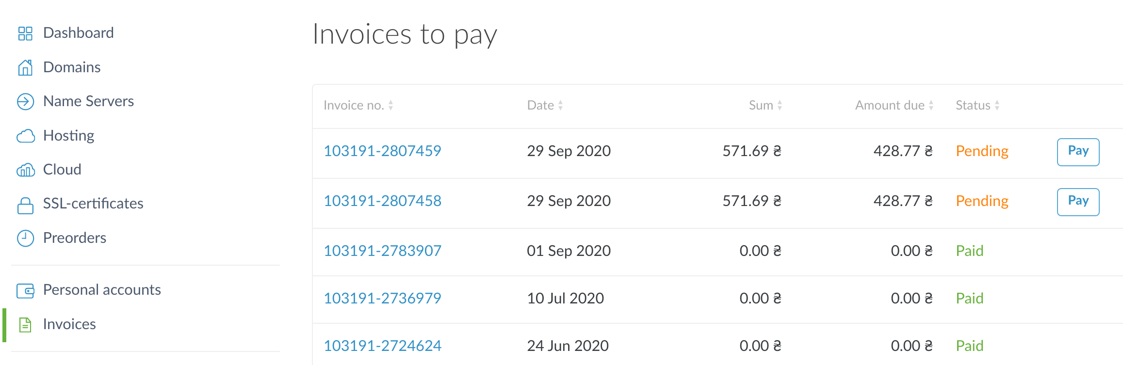 At the beginning we check that we are dealing with just the case discussed in the current article. Go to the "Invoices" menu of the NIC.UA cabinet and look at the last issued invoices. Most likely they have the same amount, both will be paid partially and when you click on each of the invoiced, there will be the same order in the description.