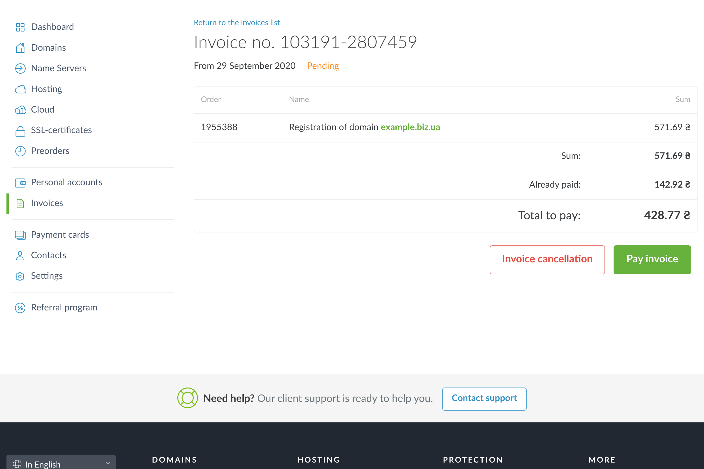 To let the order proceed in NIC.UA, the invoice for it must be paid in full.