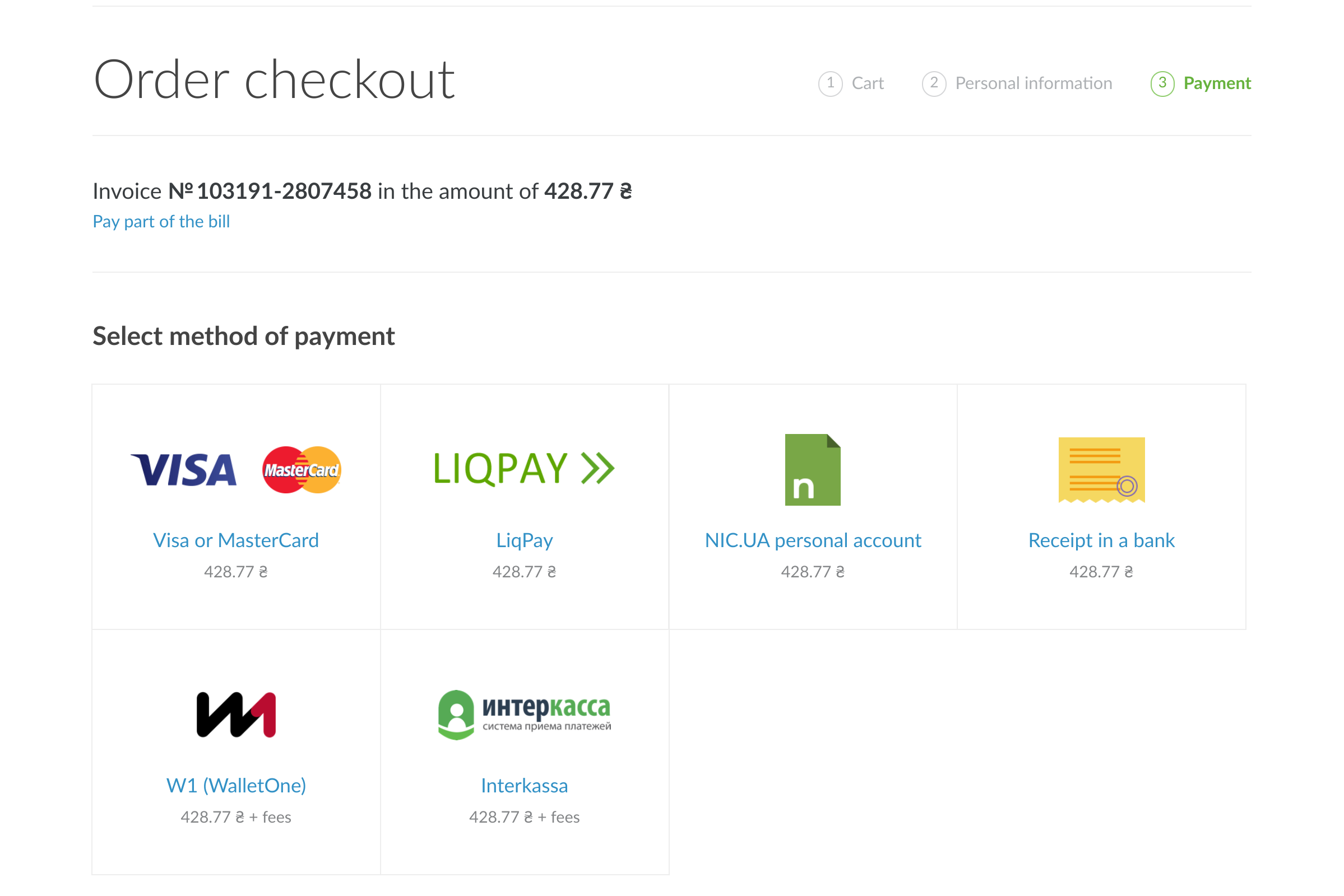 - Finally we return to the "Invoices" NIC.UA menu and pay the remaining part for the first invoice, choosing a convenient method: