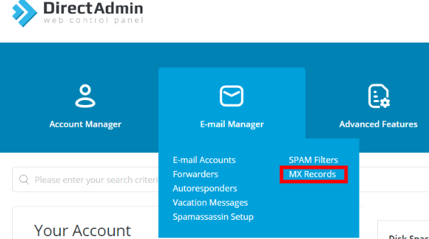 In this situation, it is important to check which mail server is set by default in the hosting panel. To do this, go from the main page of the DirectAdmin panel to the "E-mail Manager" => "MX Records".