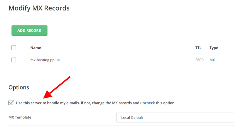 Under "Options" we are interested in the "Use this server to handle my mail" setting. If you have it enabled, it means that your mail is coming directly to your hosting mail client, if it is coming from another domain, located on the same server.