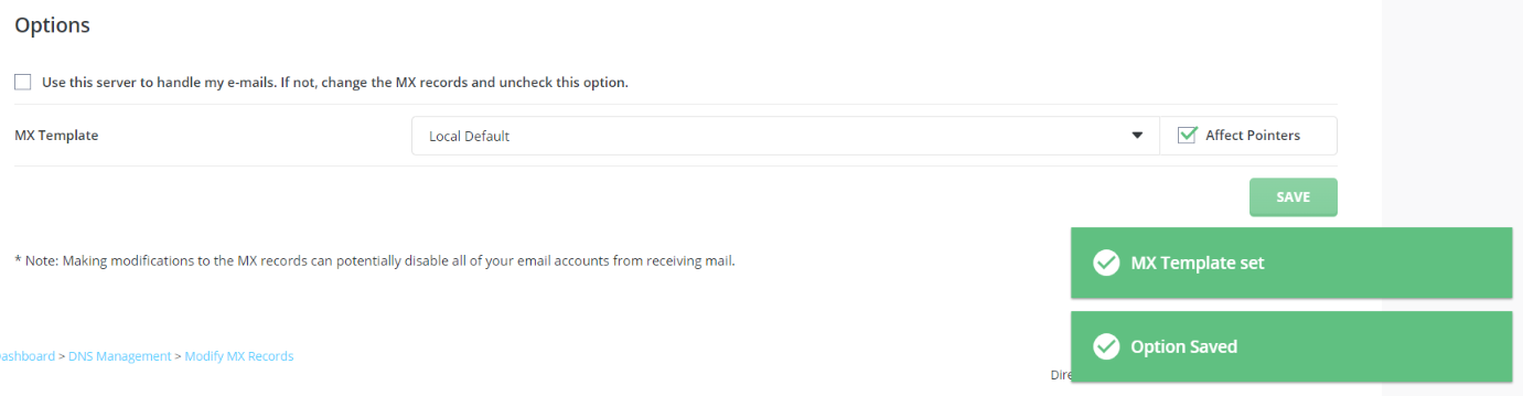 After making the settings, do not forget to save your changes. After clicking the button, the notification "MX Template Set" should appear.