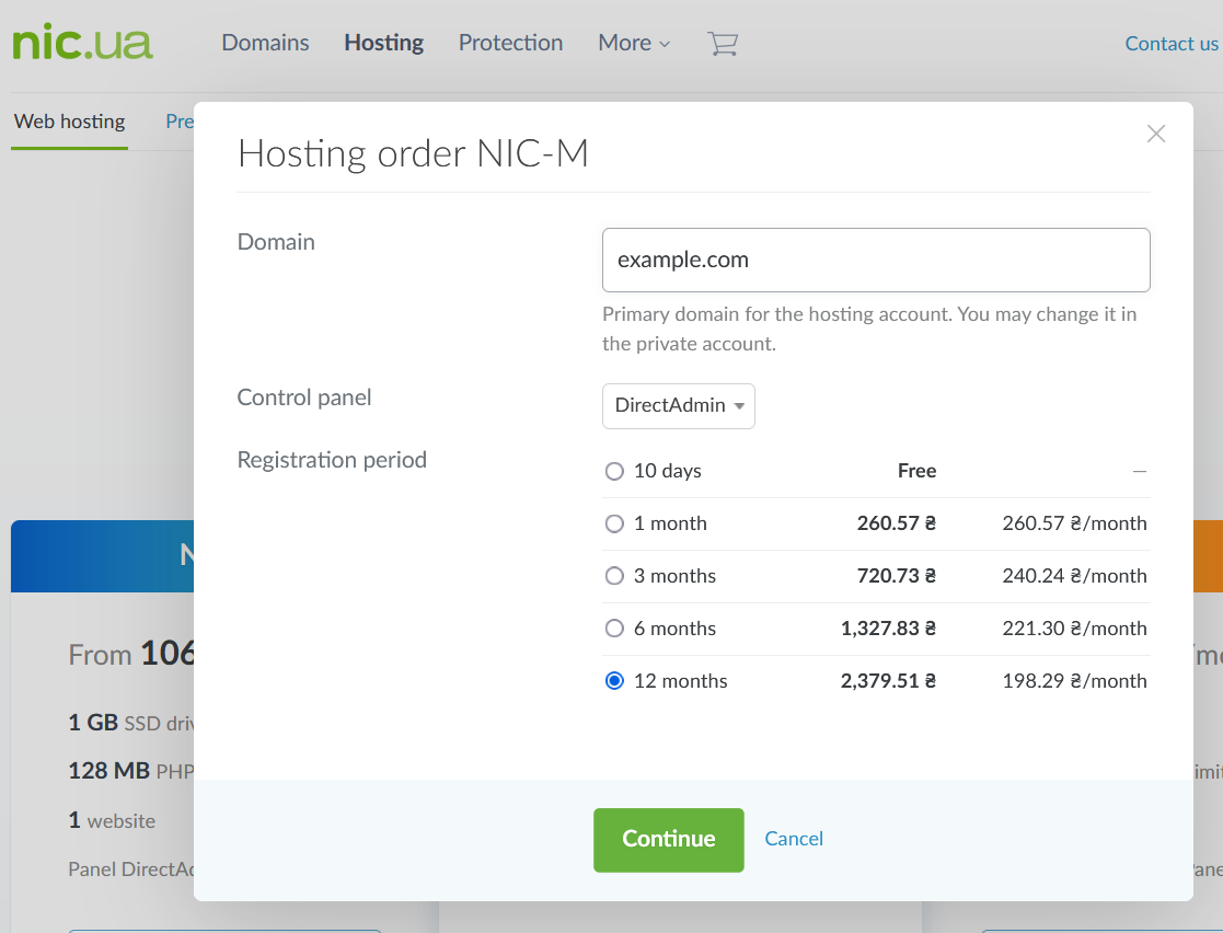 To order hosting, select the hosting plan you like and click "Choose". To place an order, enter the domain name, select a hosting panel, and a registration period. Then click "Continue. After that, all that remains is to complete the registration and pay for the order. Within minutes of payment, hosting for your website will be created.