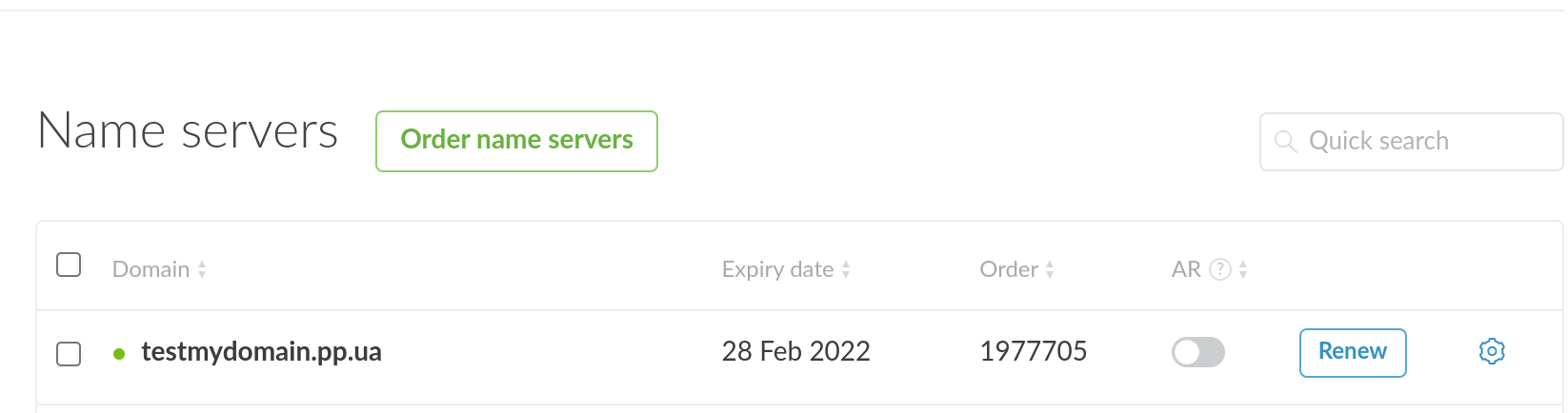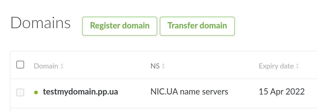 1. Go to the "Domains" menu in your NIC.UA personal account, make sure that your domain uses the "NIC.UA Name Servers".