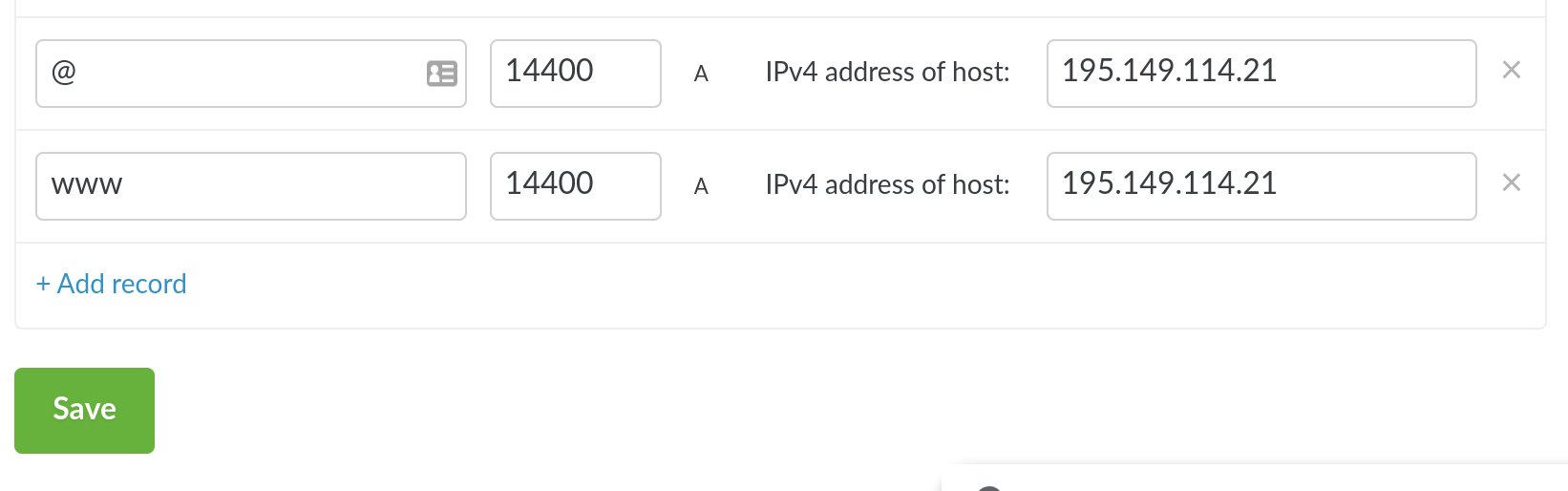 - Instead of 195.149.114.21 for the main domain (name '@') and subdomain www.example.com, enter the received IP address.