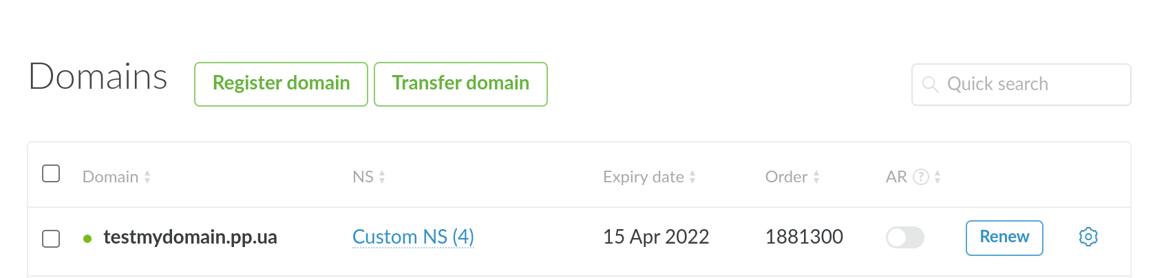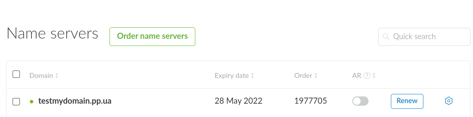 To do this, go to the "Name Servers" section and click on the gear next to the order.