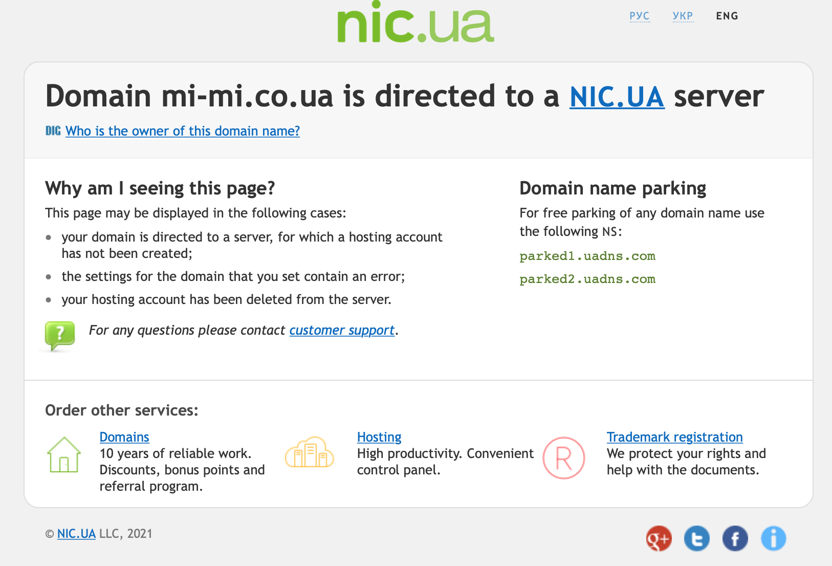 After registration of any domain in NIC.UA, you can notice that in the properties of the order in the "NS-servers" field there is a 'Parked NS' by default. The same mark is displayed next to the domain order in the 'Domains' section.