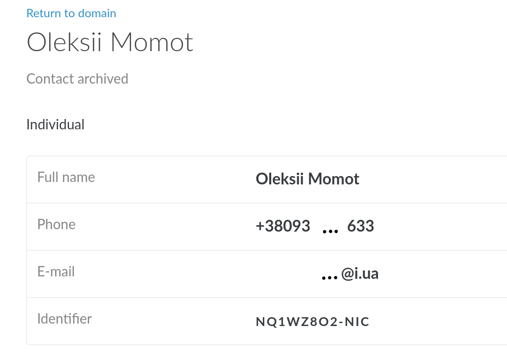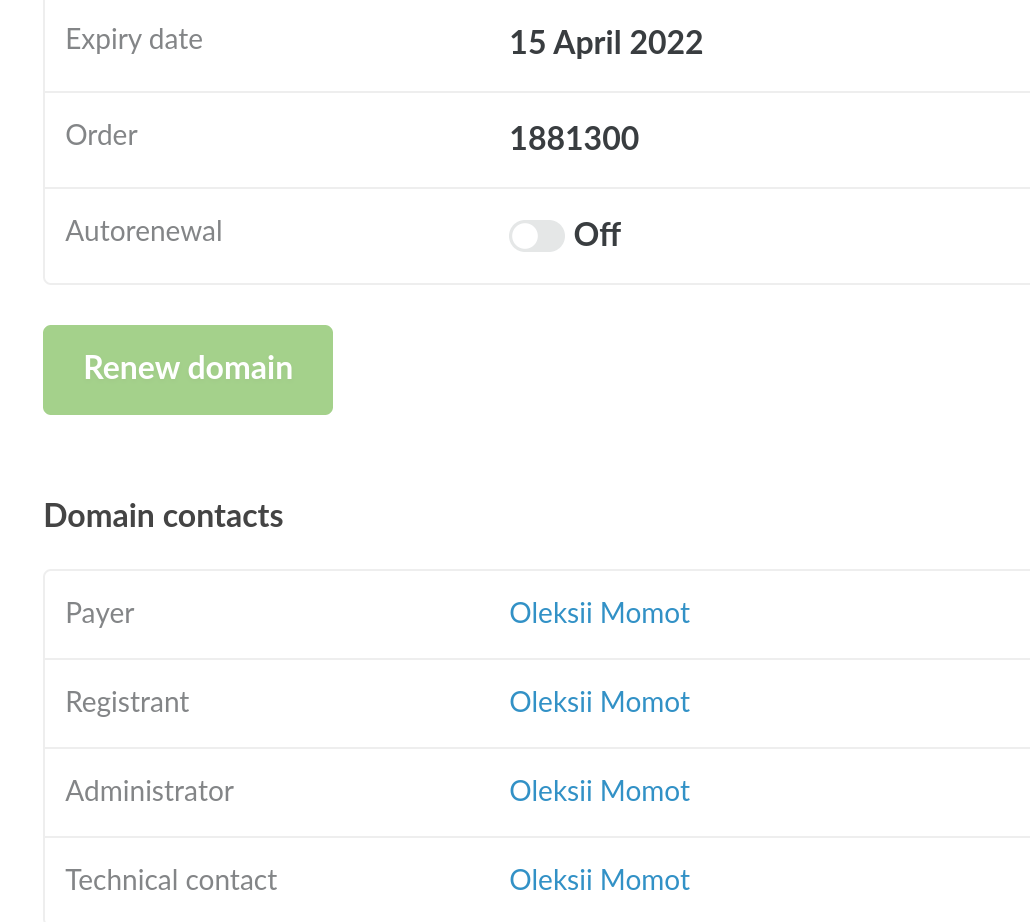 Find the subsection "Domain contacts" in the properties. The full name of the registrant or contact person (as in the screenshot) or the contact ID itself (this happens if the domain was transferred from another registrar or from another account) will be available here.