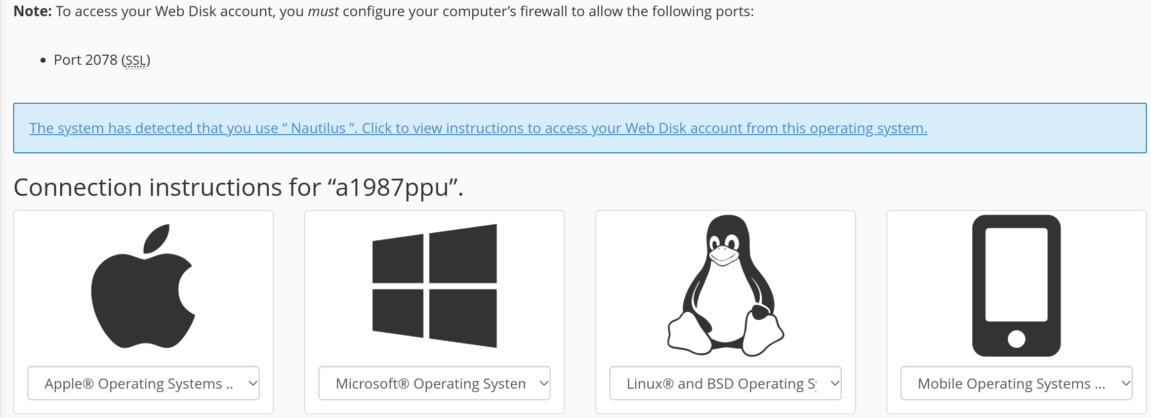 In this section, select the operating system, and then you will be provided with parameters for connecting to the web drive.