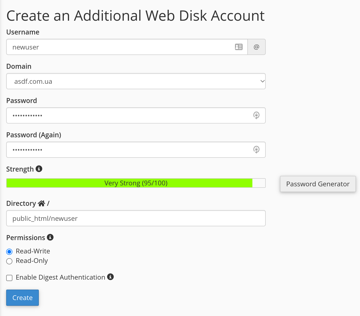 Alternatively, you can manually create a user who will only have access to one specific directory in the "Create Additional Web Disk Account" section.