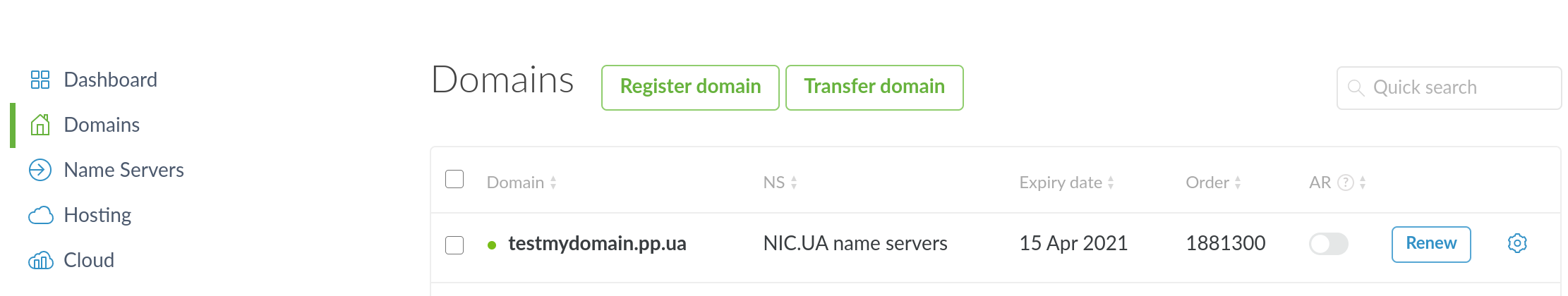 3. We are opening the "Domains" menu item and making sure that the domain order is active in our NIC.UA account and uses the "NIC.UA Name Servers" service. Also, the NS-list may be shown as:
