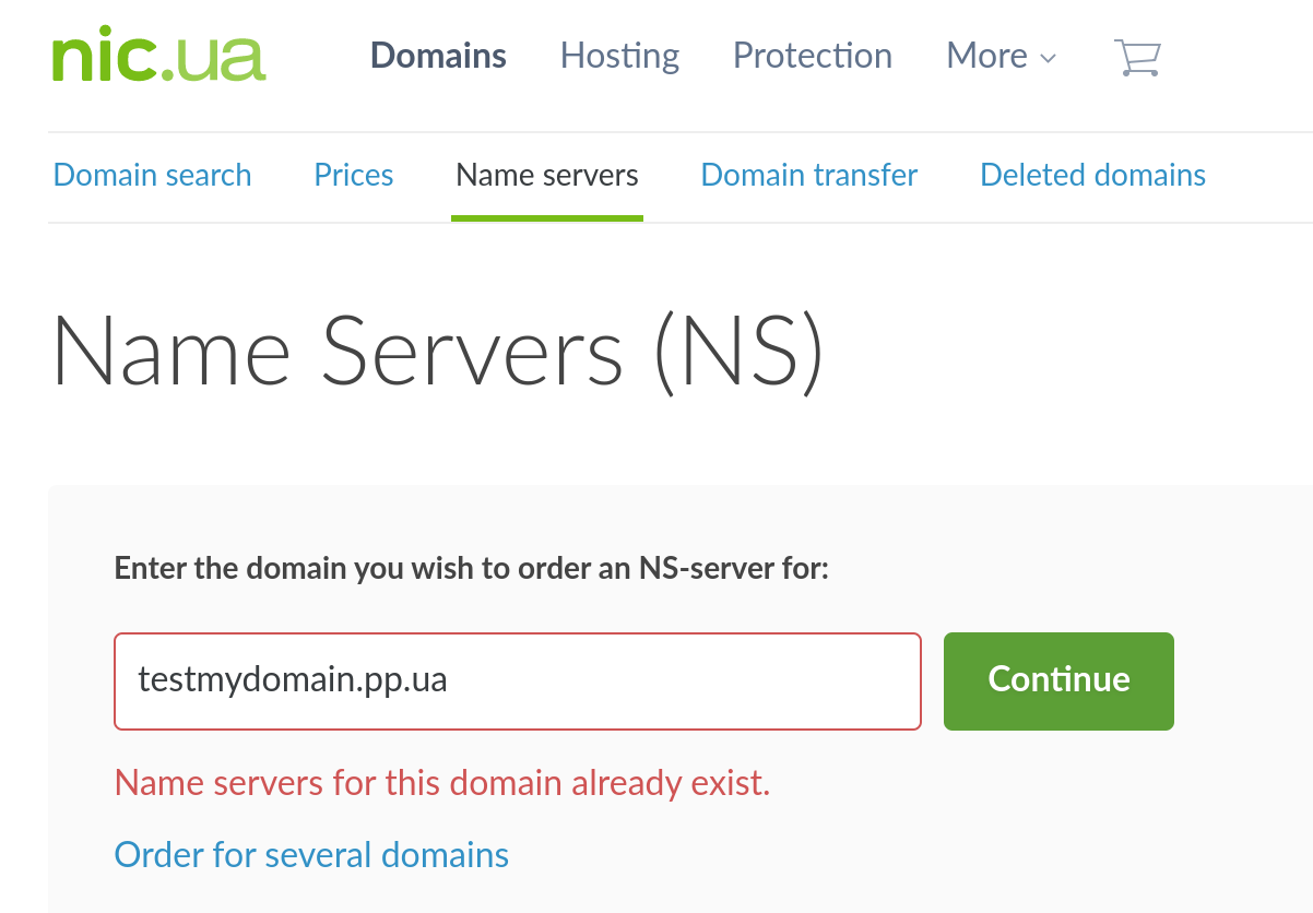 2. So we click on the "Order" button, then in the line we write the name of the required domain and click "Continue". But what if we get an error saying: "Name servers for this domain already exist", although we saw earlier that we do not have such an order in our account?