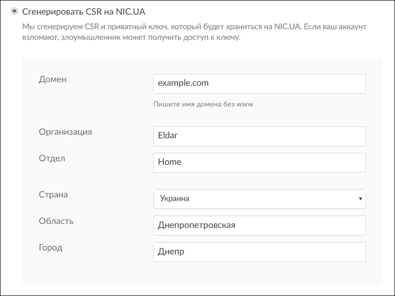 Если вы хотите создать CSR непосредственно в личном кабинете NIC.UA, выберите пункт «Сгенерировать CSR на NIC.UA» и заполните необходимые поля: