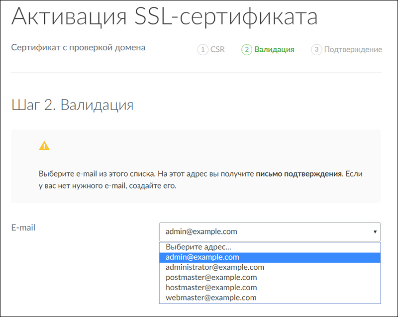 На втором шаге потребуется выбрать email, на который будет отправлено письмо подтверждения.