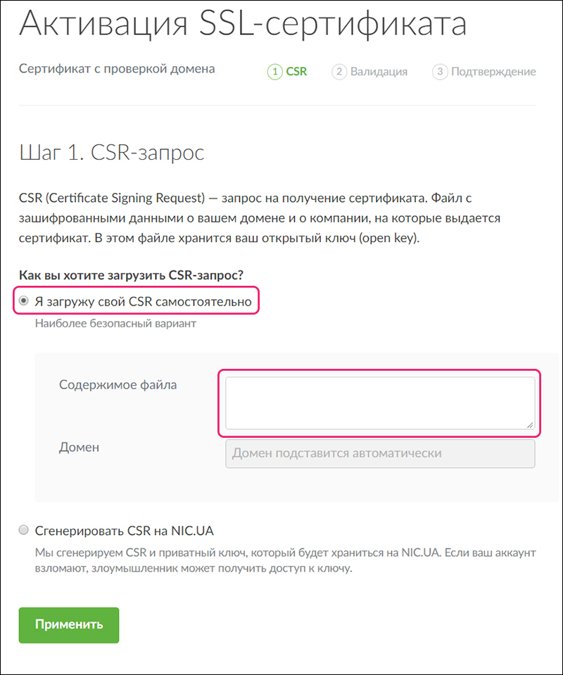- Если вы создали CSR самостоятельно, выберите пункт «Я загружу свой CSR самостоятельно» и скопируйте содержимое файлы с CSR в соответствующую форму: