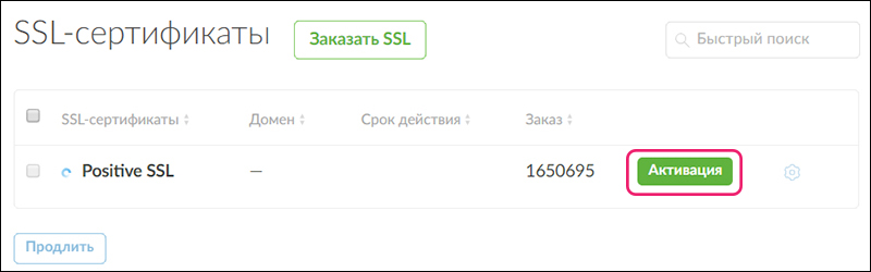 После заказа сертификата требуется выполнить активацию в личном кабинете. Перейдите в раздел «SSL-сертификаты» и нажмите на кнопку «Активация»: